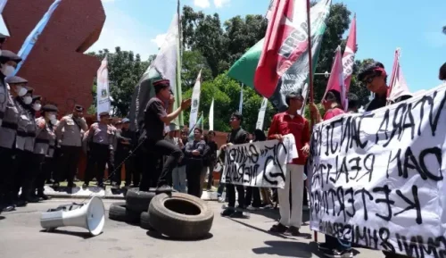 Selain melakukan orasi, sejumlah aktivis juga membawa spanduk bernadakan kekecewaan atas kondisi provinsi paling barat di Pulau Jawa tersebut.” Puncaknya, massa aksi juga membakar ban sebagai bentuk kekecewaan.