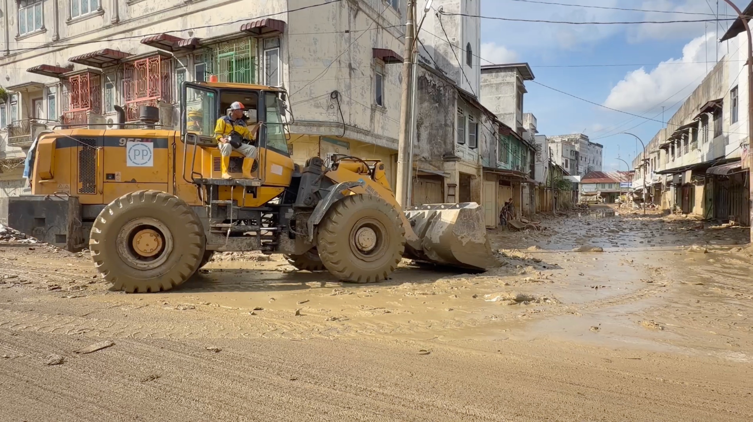 Pantauan di lapangan pada Selasa (23/12/2025) menunjukkan alat berat dengan roda besi intens berlalu-lalang membelah tumpukan lumpur yang cukup tebal. Meski deretan ruko dan rumah warga masih tampak sepi karena sebagian besar bangunan masih tergenang sisa pembersihan, geliat mobilitas warga sudah mulai terlihat.