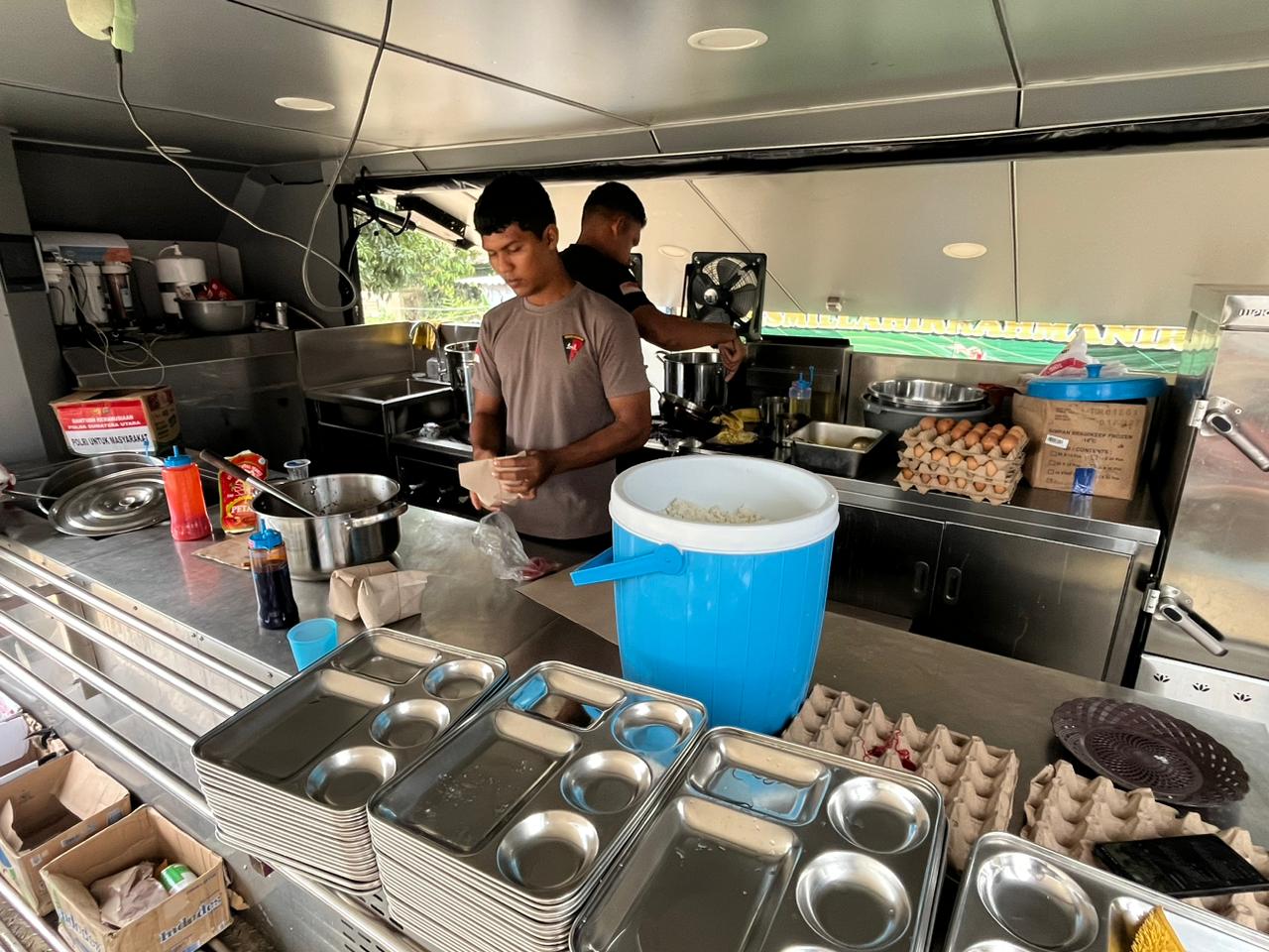 Pantauan di lokasi, Kamis (15/1/2026), dua personel Polri terlihat bersiaga di dapur mobile. Seorang personel membungkus nasi dan lauk, sementara personel lainnya memasak di depan kompor untuk memastikan ketersediaan makanan bagi warga yang datang silih berganti.
