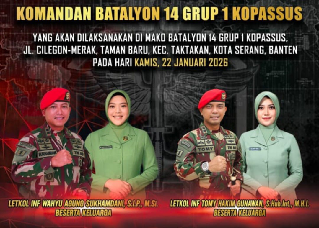 Kegiatan pergantian Danyon 14 Grup 1 Kopassus tersebut dilaksanakan di Markas Komando (Mako) Grup 1 Kopassus Taman, Serang-Banten pada Kamis, (22/1/2026)