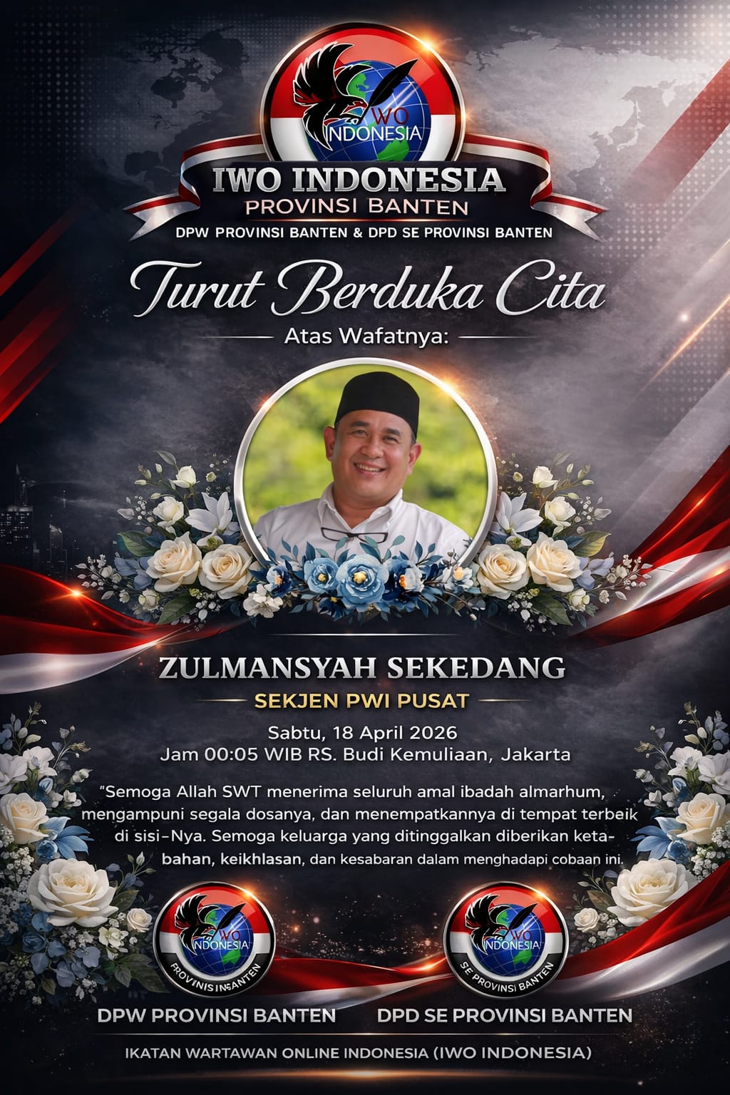 TintaRaya, TANGERANG – Keluarga besar Dewan Pimpinan Wilayah (DPW) dan Dewan Pimpinan Daerah (DPD) Ikatan Wartawan Online Indonesia (IWO-I) se-Provinsi Banten menyampaikan duka cita yang mendalam atas wafatnya Zulmansyah Sekedang, Sekretaris Jenderal PWI. Sabtu, (18/4/2026)