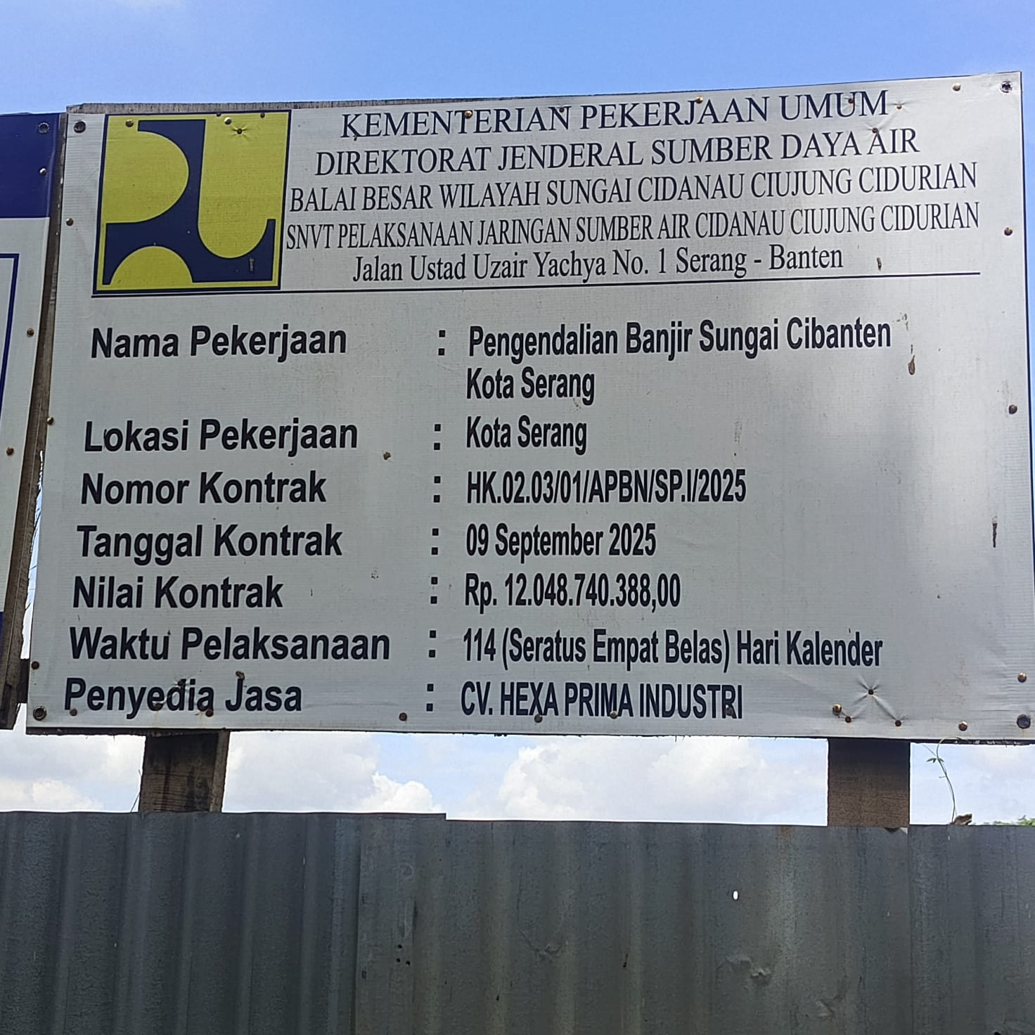 Pekerjaan tersebut dari Kementrian Pekerjaan Umum Direktorat Jendral Sumber Daya Air Balai Besar Wilayah Sungai Cidanau Ciujung Cidurian, yaitu satuan Kerja SNVT Pelaksanaan Jaringan Sumber Air Cidanau Ciujung Cidurian dengan nilai Pagu Rp.12.048.740.388 (Dua belas milyar empat puluh delapan juta tujuh ratus empat puluh ribu tiga ratus delapan puluh delapan rupiah) yang dikerjakan oleh penyedia jasa : CV.Hexa Prima Industri dengan waktu pelaksanaan: 114 hari kalender