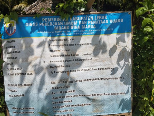 Diketahui berdasarkan Papan Informasi Proyek (PIP ) Bahwa pekerjaan dari, Pemerintah kabupaten Lebak melalui Dinas Pekerjaan Umum dan Penataan Ruang Bidang Bidang Bina Marga, Program Penyelenggara jalan, Kegiatan Penyelenggara Jalan Kabupaten / Kota, Sub Kegiatan : Rekontruksi Jalan Kumpay – Cipariama, Lokasi Kecamatan Banjarsari, Kabupaten Lebak, Penyedia jasa : CV. Putri Kencana, Nomor surat perjanjian : 600.1.8.2 / OJD-P2507-11995358/PPK/SP/RKJ-BM / DPUPR / APBD /2025, Tanggal 04 Agustus, Nilai kontrak : Rp 1.126.485,000,00.-Akhir pelaksanaan tanggal 17 September 2025