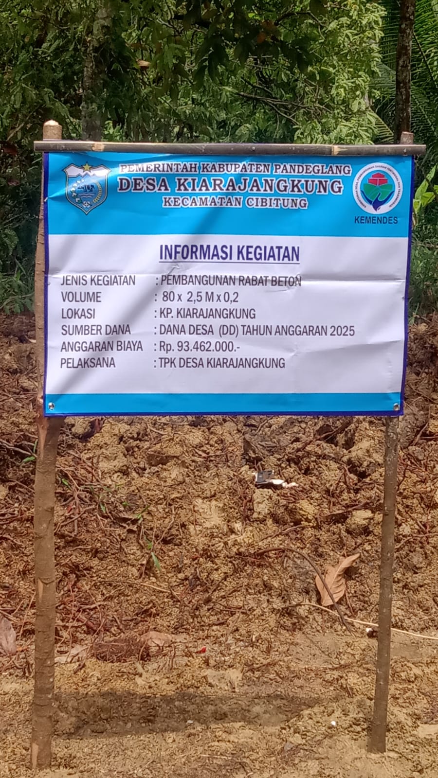 “ Diketahui bahwa pelaksanaan pembangunan jalan rabat beton ini yaitu di desa Kiarajangkung, Kecamatan Cibitung, Kabupaten Pandeglang, Provinsi Banten “ sumber anggaran dari Dana Desa (DD) tahun anggaran 2025, Volume 80 x 2,5 x 0.20 “ dengan anggaran sebesar Rp 93.462.000,- ( Sembilan puluh tiga juta empat ratus enam puluh dua ribu rupiah ) Pelaksana : TPK desa Kiarajangkung “ JelasNya