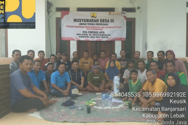 Diketahui bahwa di Desa Keusik, Kecamatan Banjarsari, Kabupaten Lebak, Provinsi Banten “ pada tahun 2025 sekarang, mendapatkan bantuan P3TGAI, serta dalam pelaksanaan pembagunanya sudah selesai di laksanakan.