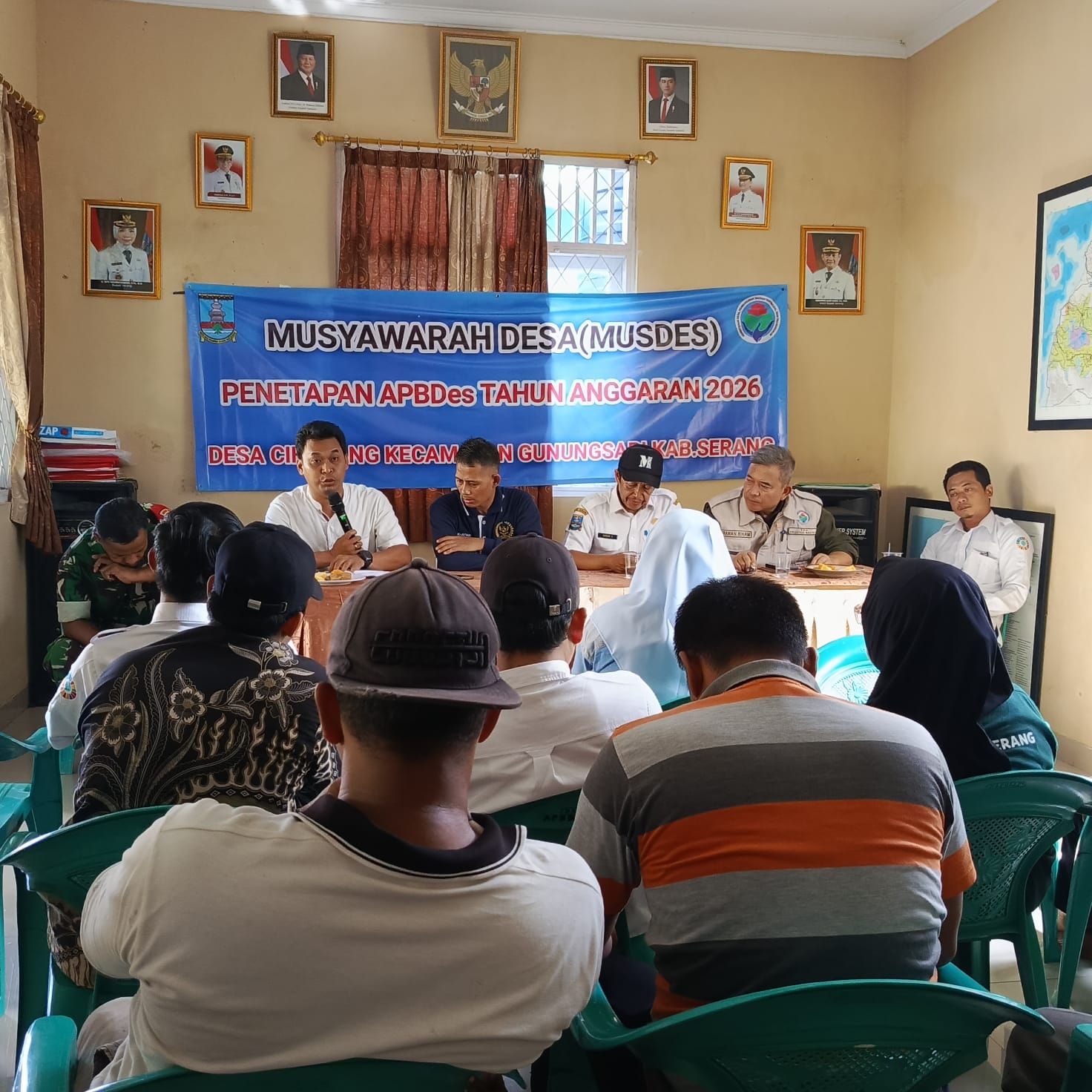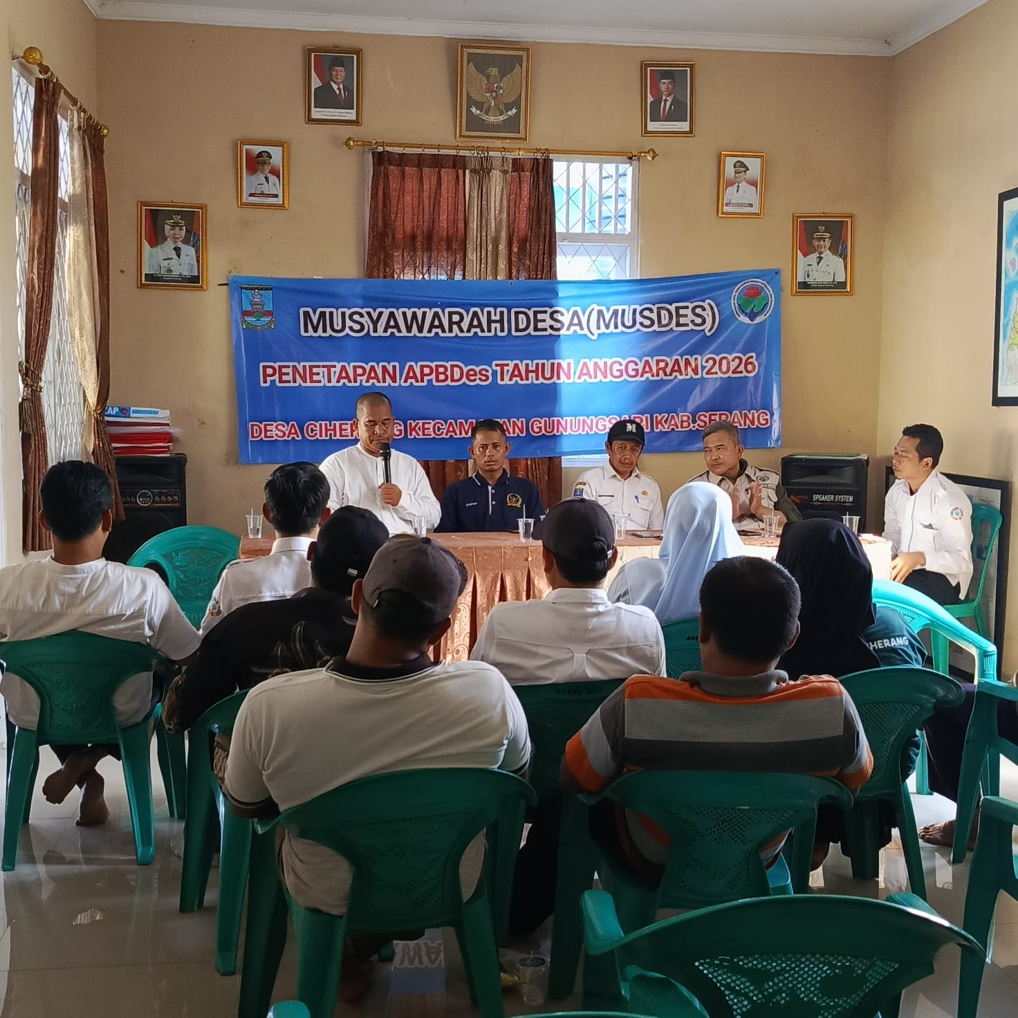 TintaRaya, SERANG – Pemerintah Desa (Pemdes)Ciherang, Kecamatan Gunungsari, Kabupaten Serang Provinsi Banten menggelar musyawarah desa (Musdes) dalam rangka penetapan dan pengasahan Anggaran Pendapatan Belanja Desa (APBDes) tahun anggaran 2026. Kegiatan berlangsung di Aula Desa Ciherang pada Rabu, (22/12/2025) pukul 13.00 WIB dan dihadiri oleh Kades Ciherang, Sekdes Ciherang, Kasipem Kecamatan Gunungsari, Pendamping Desa, BPD, Babinsa, Babinkamtibmas, Kader PKK, Kader Posyandu, Tokoh masyarakat dan Ketua RT dan RW se-desa Ciherang
