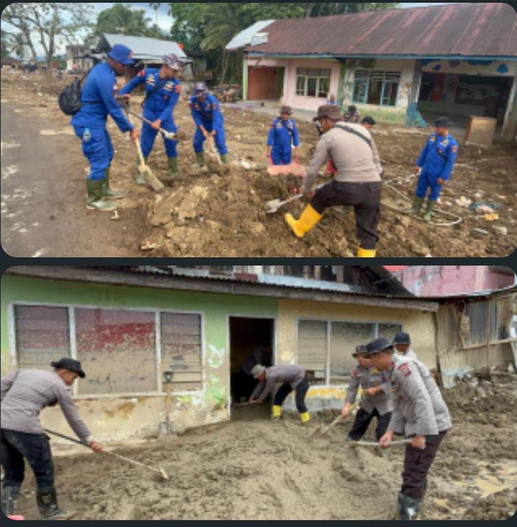 Pantauan di lokasi, para personel Brimob dikerahkan membersihkan lumpur, sampah, dan sisa material banjir di area sekitar rumah warga dan sepanjang jalan. Kegiatan ini dilakukan sebagai upaya untuk memperbaiki akses sarana dan prasarana, agar warga dapat kembali beraktivitas normal.