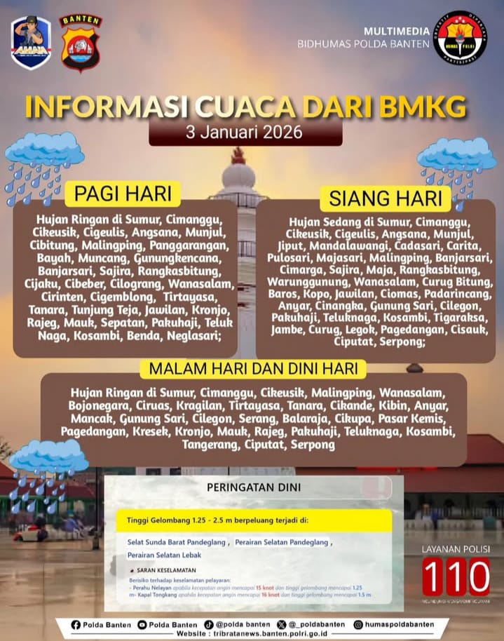 Plh. Kabidhumas Polda Banten AKBP Meryadi menyampaikan bahwa pada Pagi hari Berawan sampai Hujan Ringan di Sumur, Cimanggu, Cikeusik, Cigeulis, Angsana, Munjul, Cibitung, Malingping, Panggarangan, Bayah, Muncang, Gunungkencana, Banjarsari, Sajira, Rangkasbitung, Cijaku, Cibeber, Cilograng, Wanasalam, Cirinten, Cigemblong, Tirtayasa, Tanara, Tunjung Teja, Jawilan, Kronjo, Rajeg, Mauk, Sepatan, Pakuhaji, Teluk Naga, Kosambi, Benda, Neglasari.