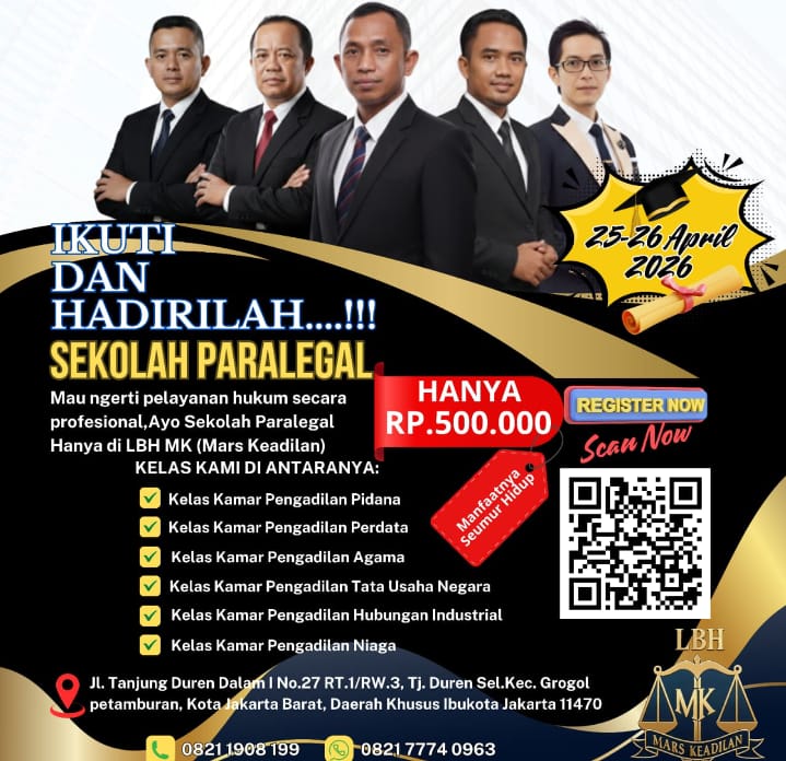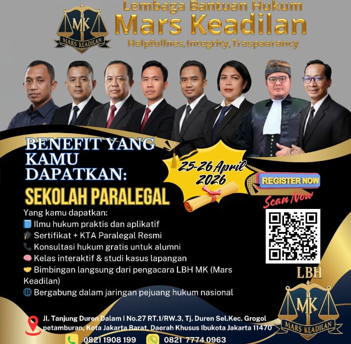 TintaRaya, JAKARTA – Lembaga Bantuan Hukum (LBH) Mars Keadilan (MK) secara resmi mengumumkan pembukaan pendaftaran Sekolah Paralegal 2026. Program pendidikan hukum rakyat ini dirancang khusus untuk mencetak agen perubahan yang tangguh dan mampu memberikan pendampingan hukum mandiri bagi masyarakat luas.